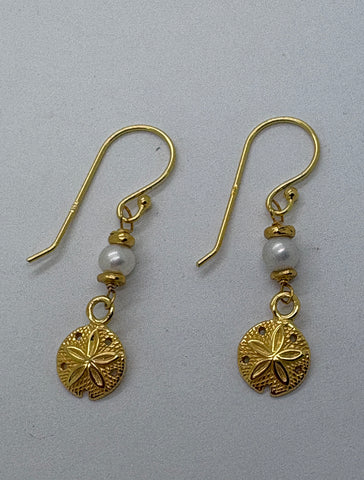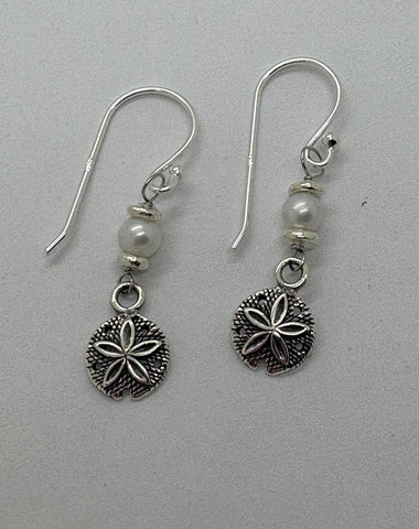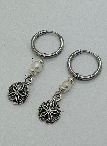 8mm Round Sand Dollar charms, with Freshwater Pearl on clip in Surgical Stainless Steel Huggies or Sterling Silver Hooks.